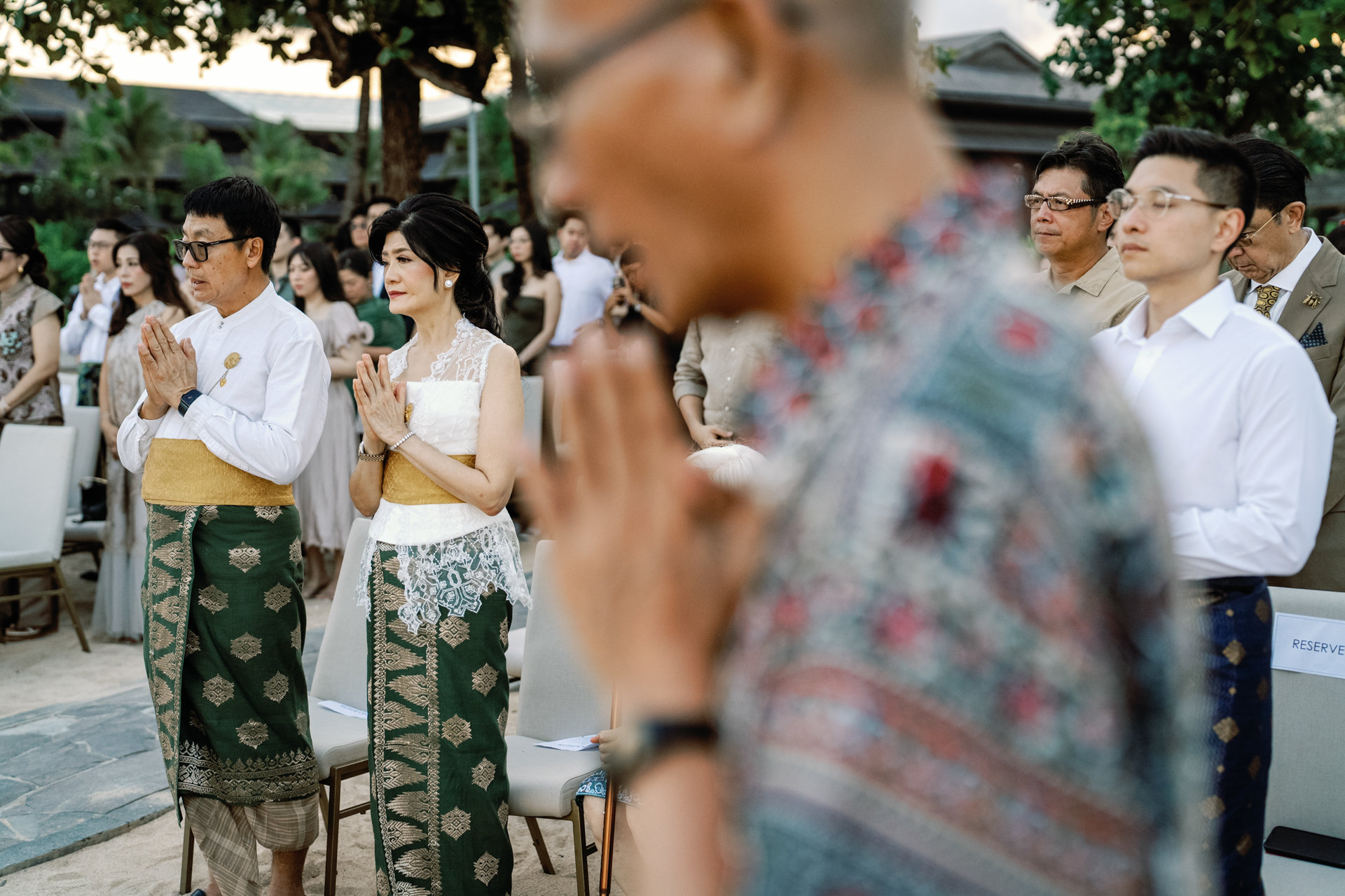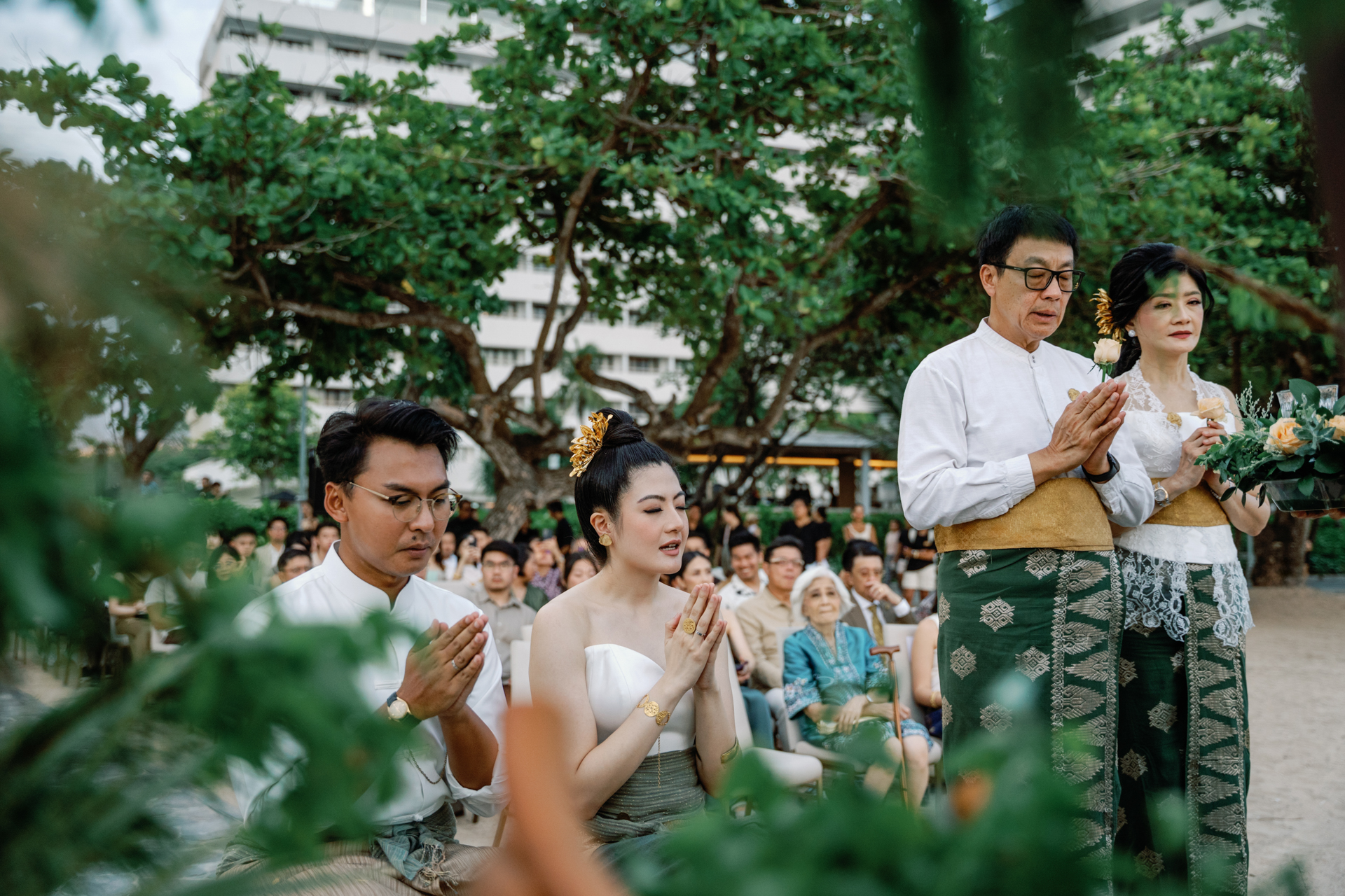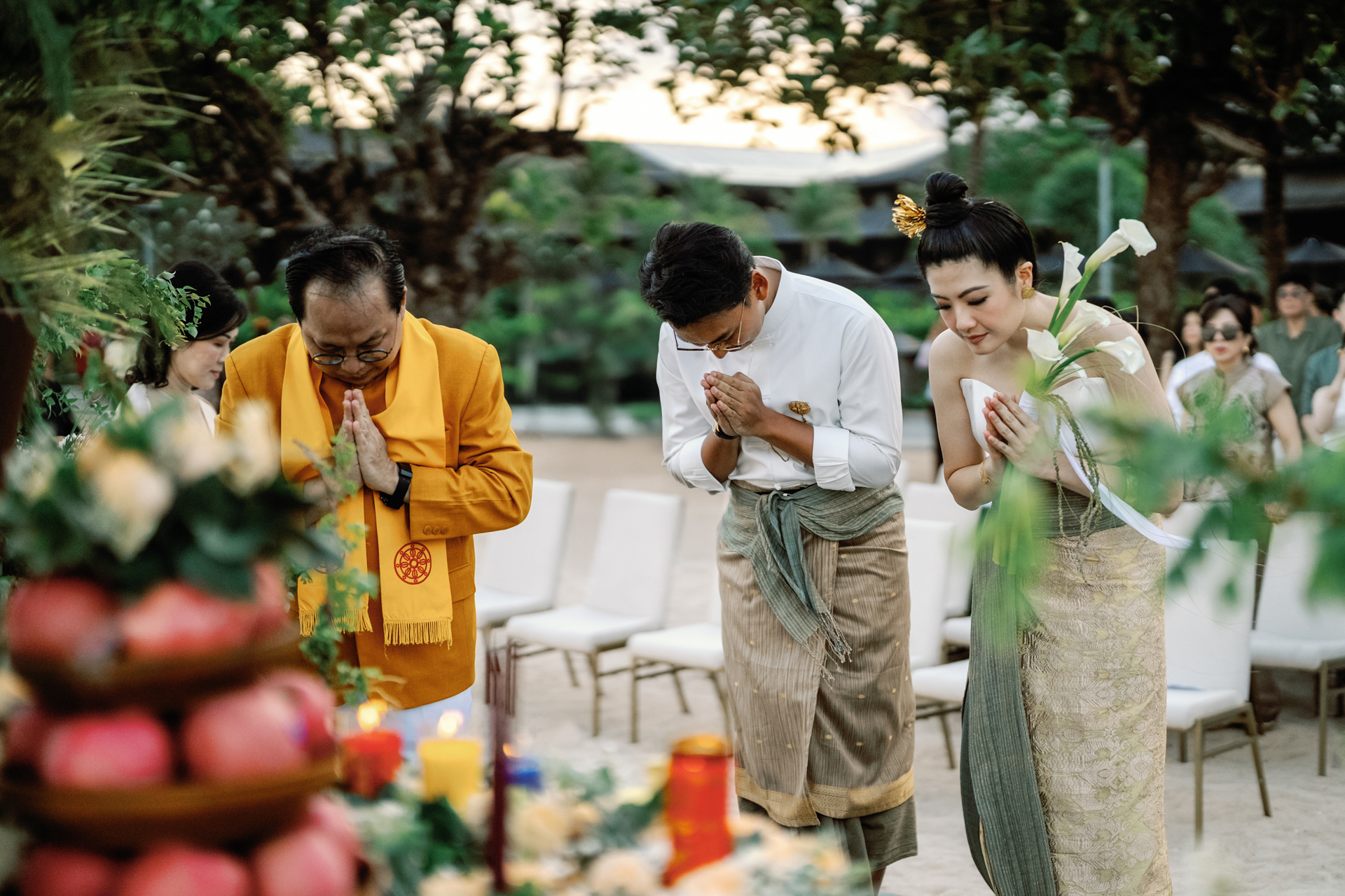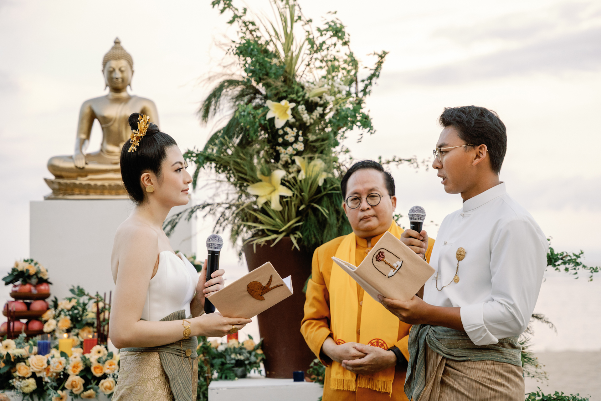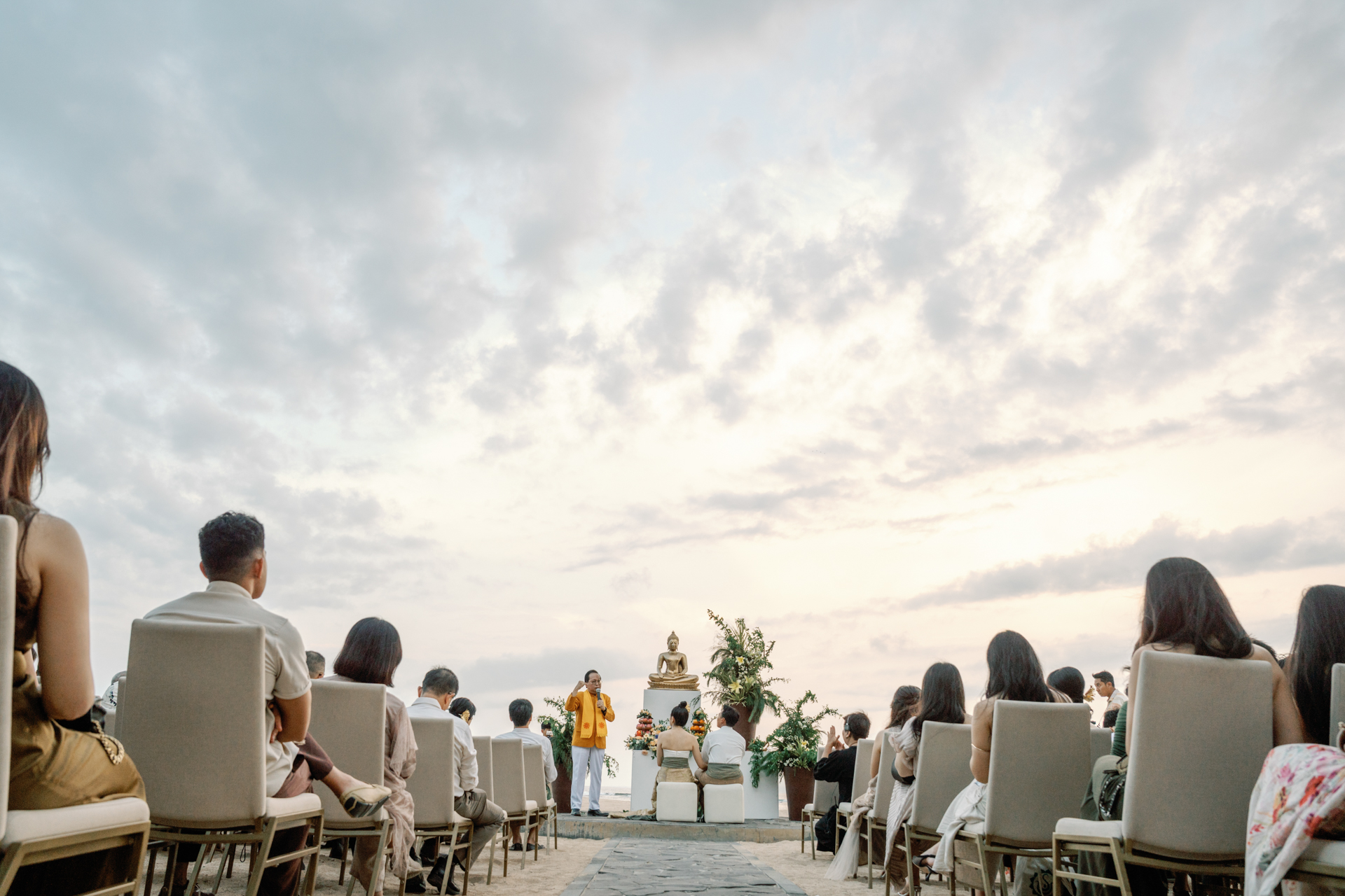 Their union was marked by a deeply symbolic Buddhist wedding ceremony, where every ritual was performed with intention and mindfulness. Guided by a monk and witnessed by their closest family and friends, the ceremony unfolded with offerings, prayers, and quiet moments of reflection. With the ocean just steps away, the natural rhythm of the beachfront setting soft sea air, open skies, and surrounding greenery the sense of peace throughout the ceremony.