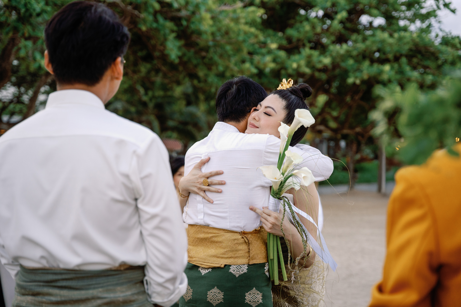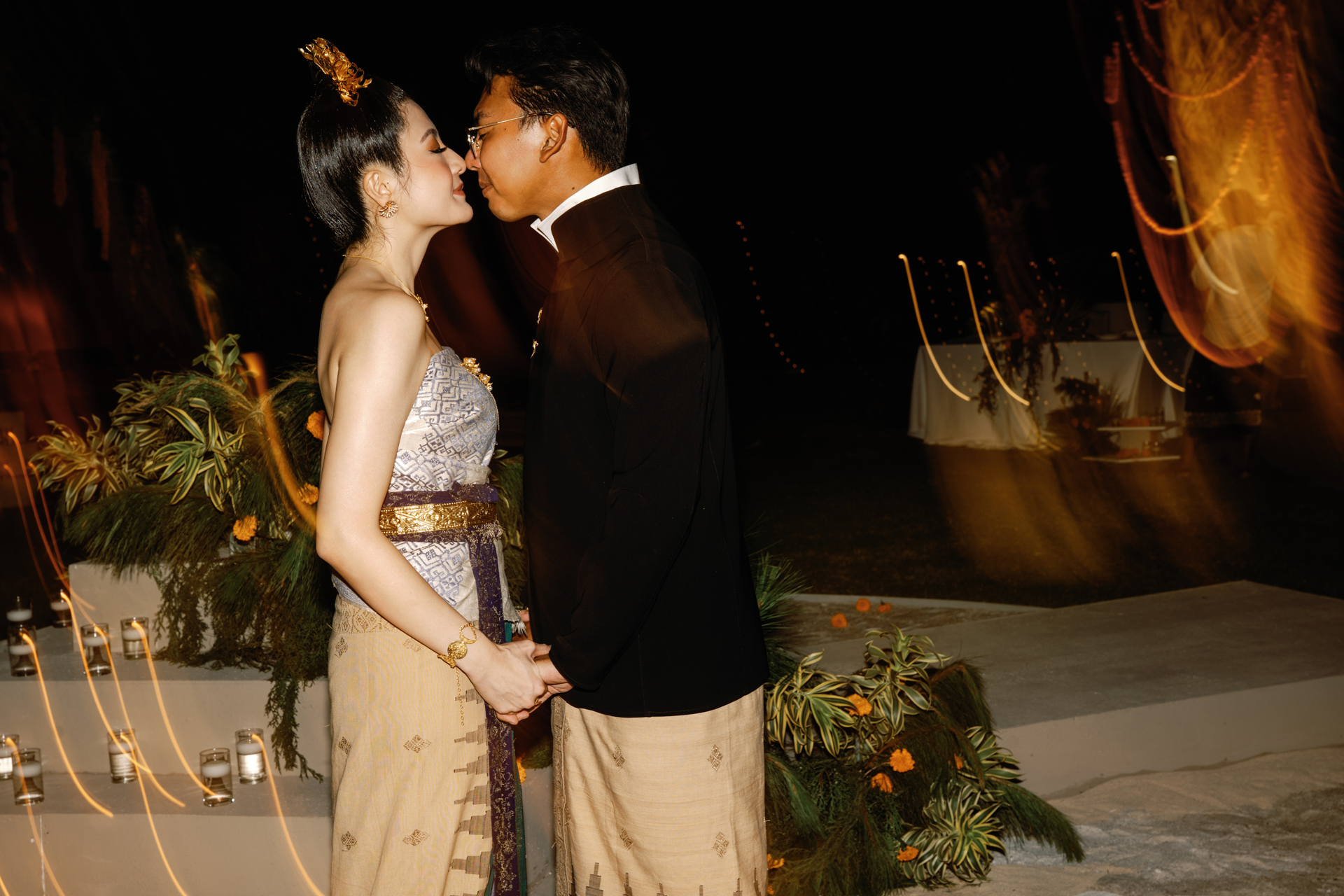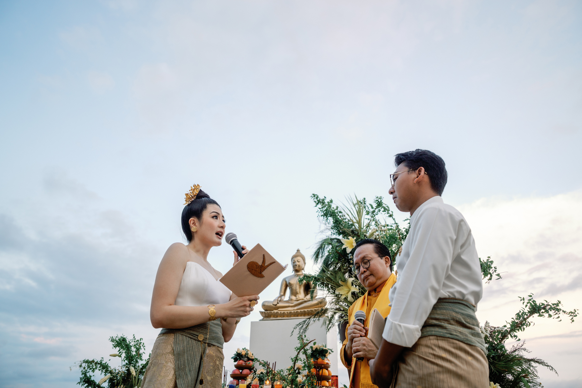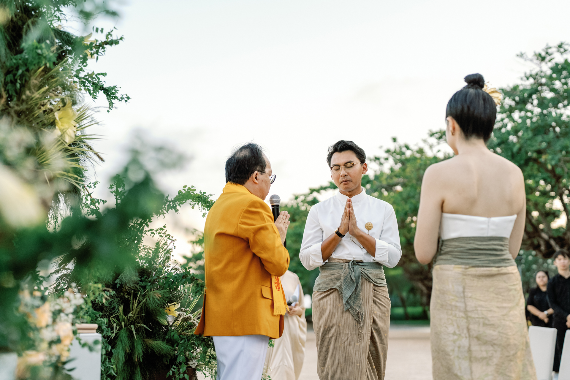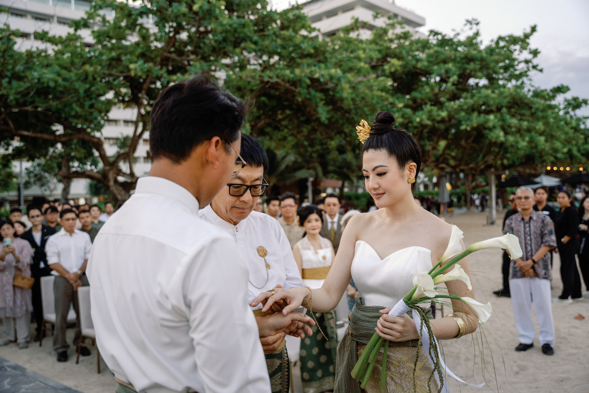 Their union was marked by a deeply symbolic Buddhist wedding ceremony, where every ritual was performed with intention and mindfulness. Guided by a monk and witnessed by their closest family and friends, the ceremony unfolded with offerings, prayers, and quiet moments of reflection. With the ocean just steps away, the natural rhythm of the beachfront setting soft sea air, open skies, and surrounding greenery the sense of peace throughout the ceremony.