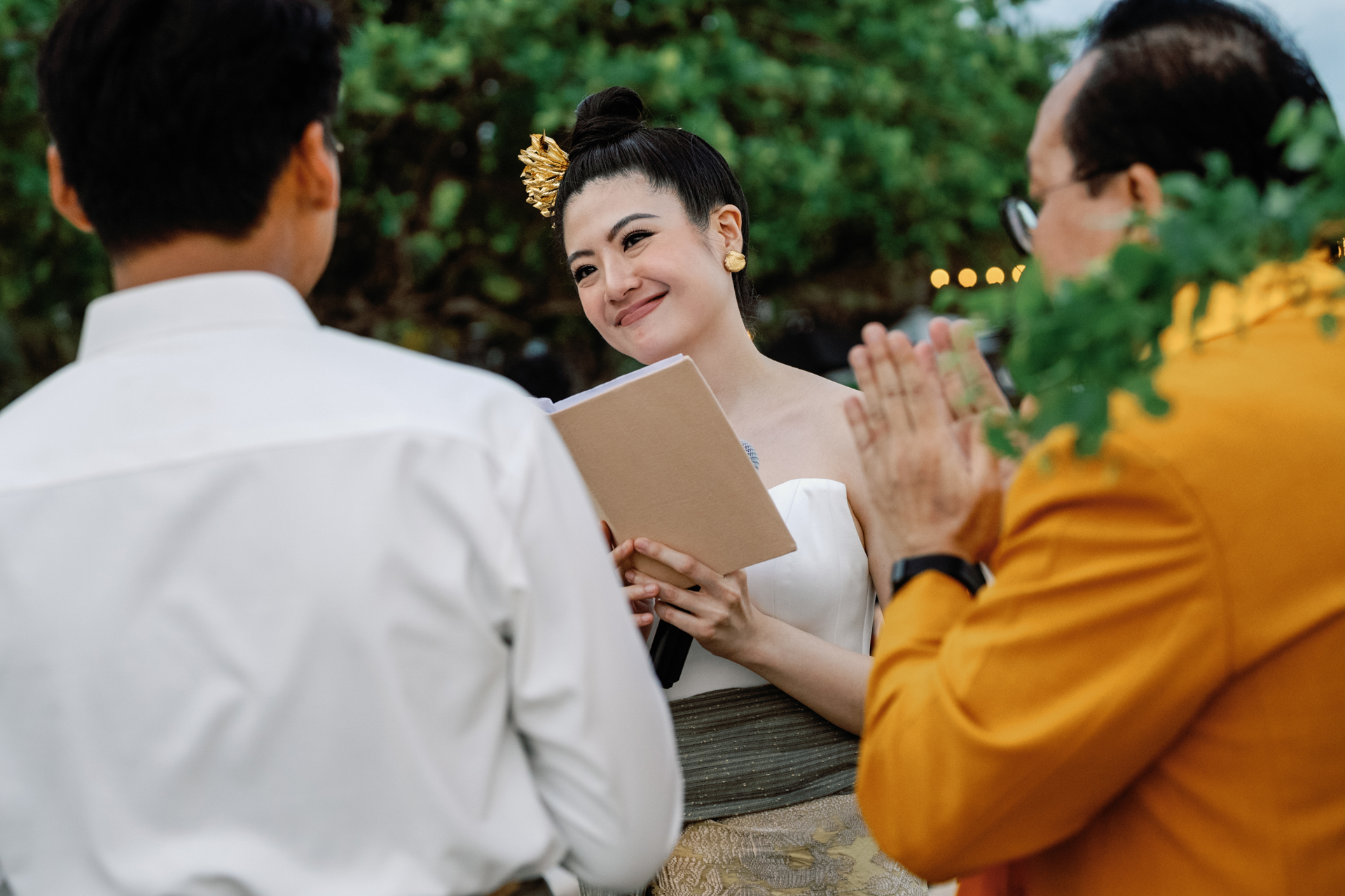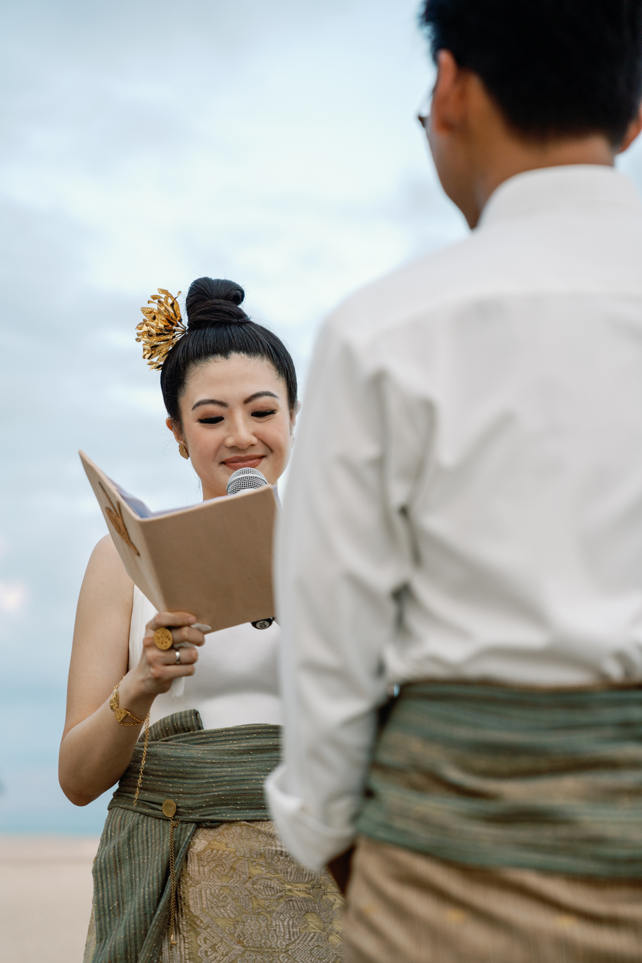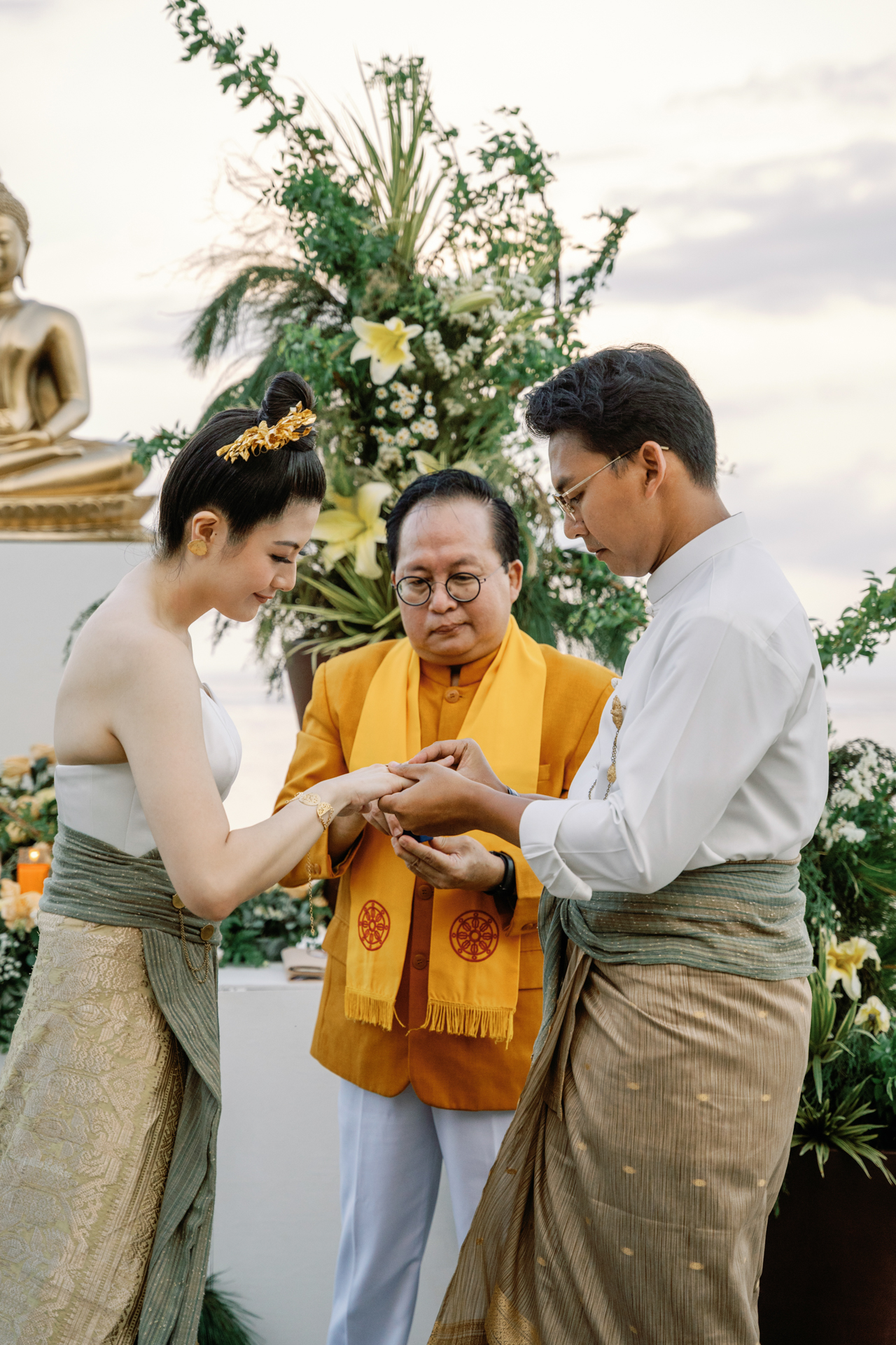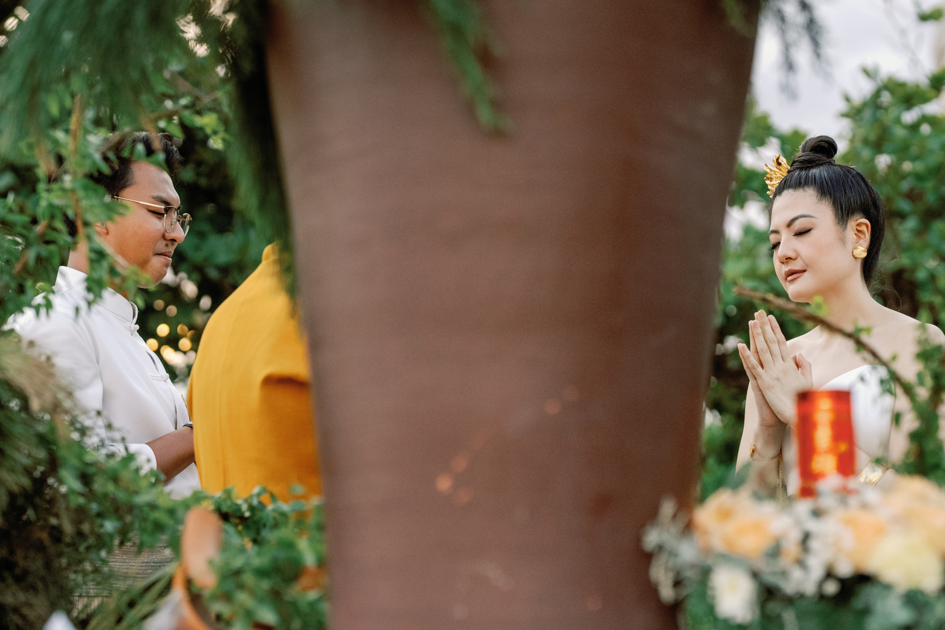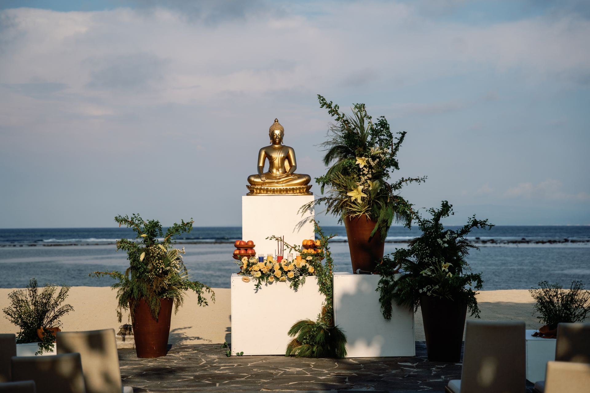 Their union was marked by a deeply symbolic Buddhist wedding ceremony, where every ritual was performed with intention and mindfulness. Guided by a monk and witnessed by their closest family and friends, the ceremony unfolded with offerings, prayers, and quiet moments of reflection. With the ocean just steps away, the natural rhythm of the beachfront setting soft sea air, open skies, and surrounding greenery the sense of peace throughout the ceremony.