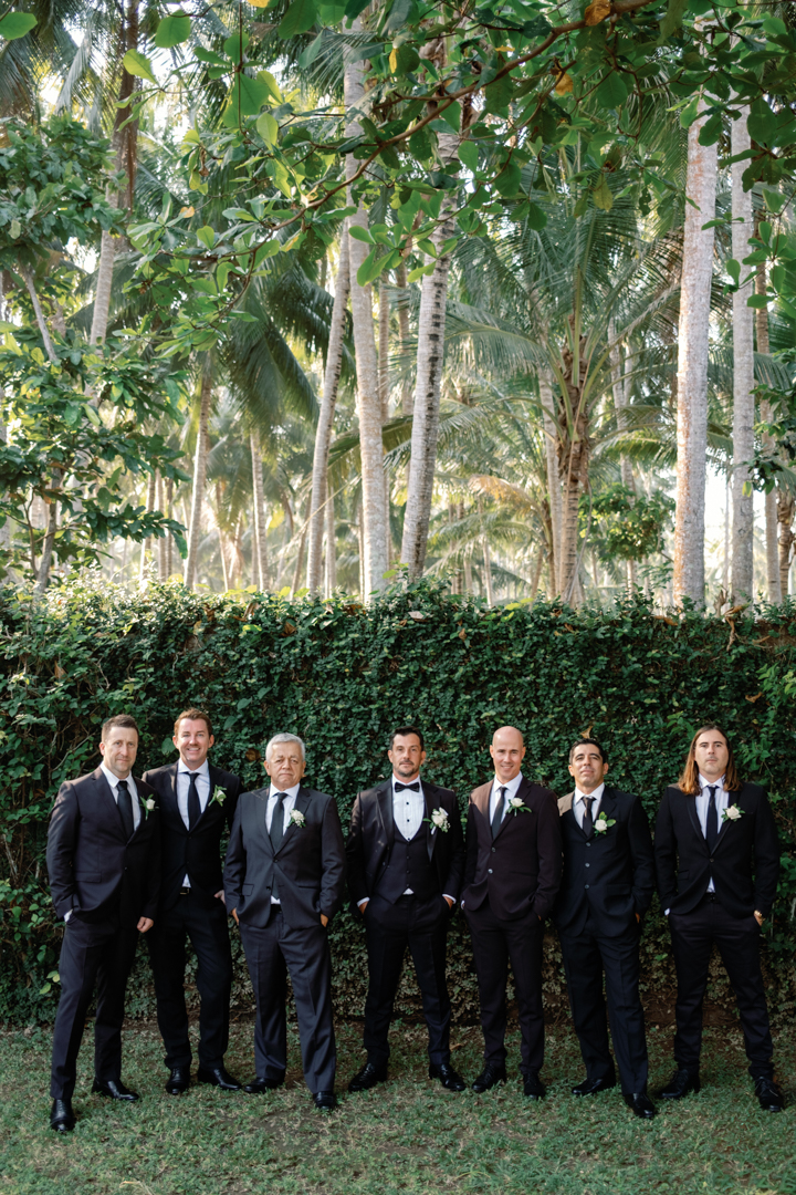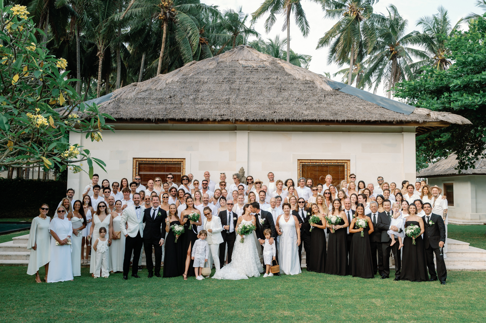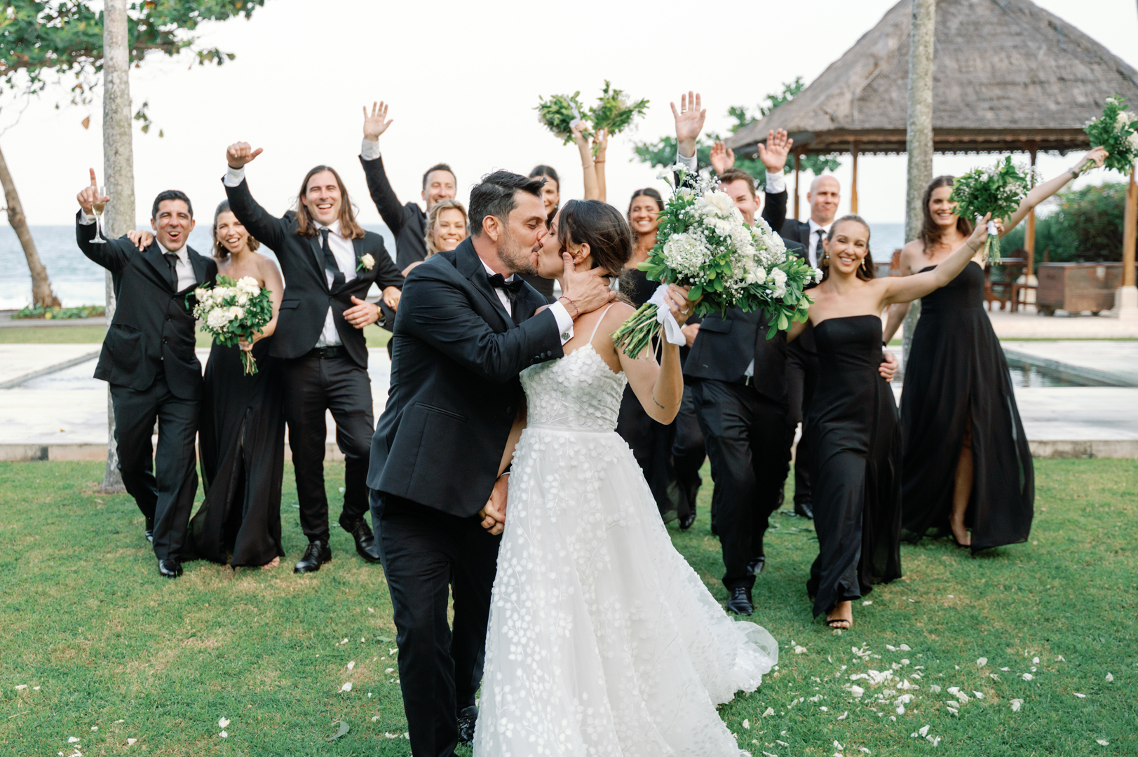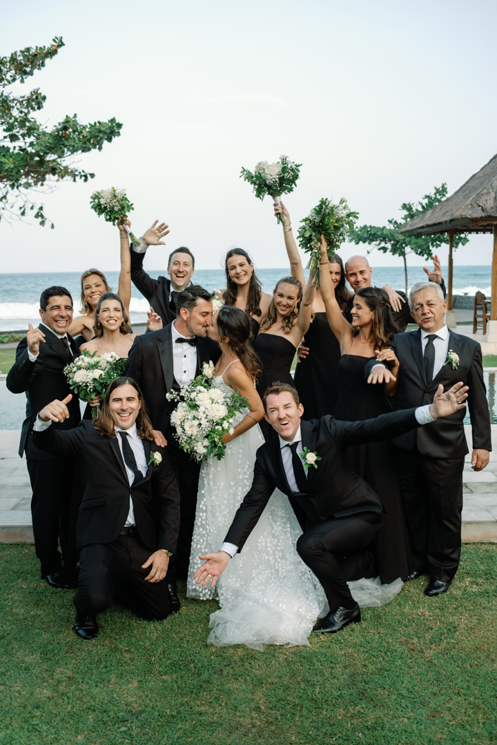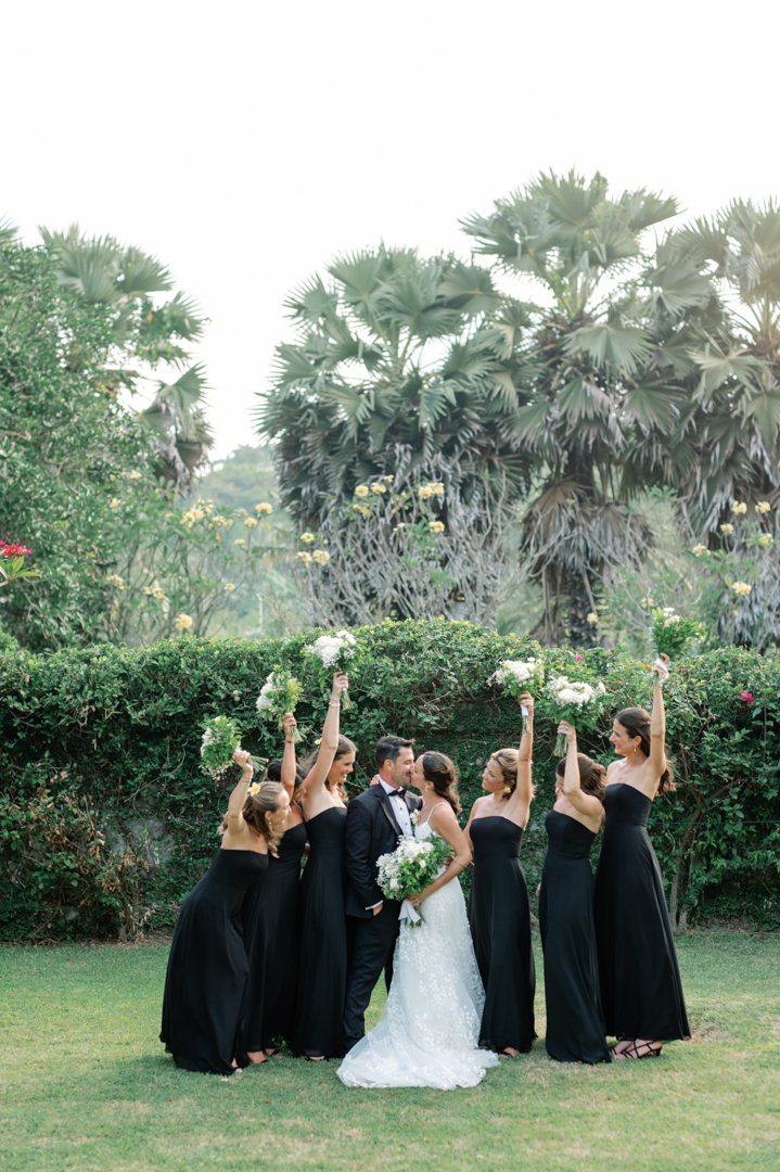 The bride looked stunning in a classic white gown, while the groom’s timeless black suit gave the perfect contrast. Bridesmaids wore black dresses, complementing the groom’s look, while guests dressed in white—together creating a harmonious color palette that blended seamlessly with the garden surroundings. It was a wedding where every detail felt intentional and perfectly balanced.