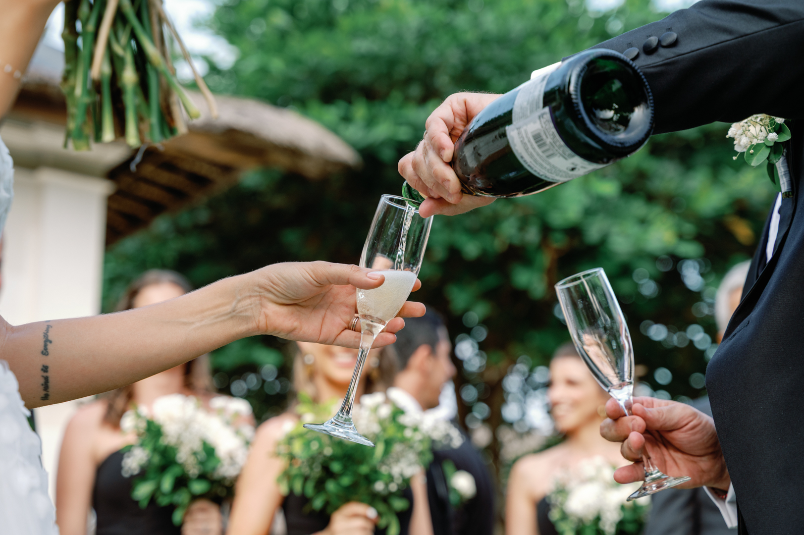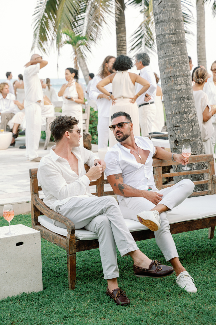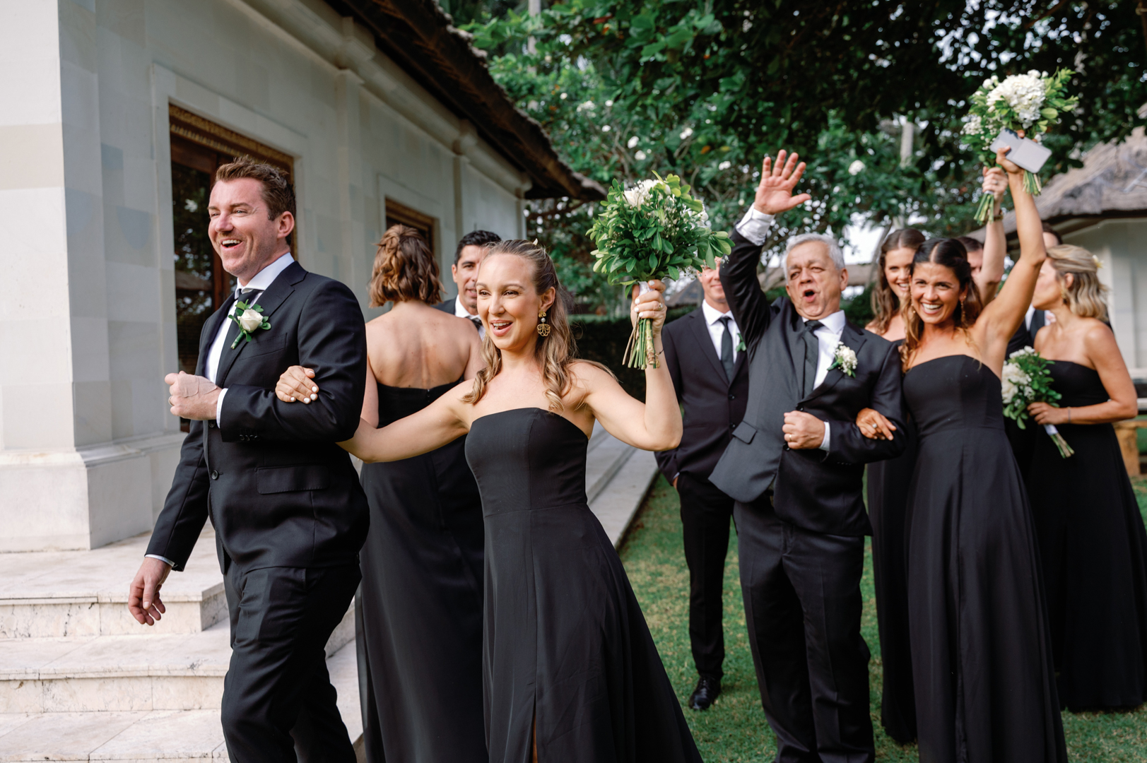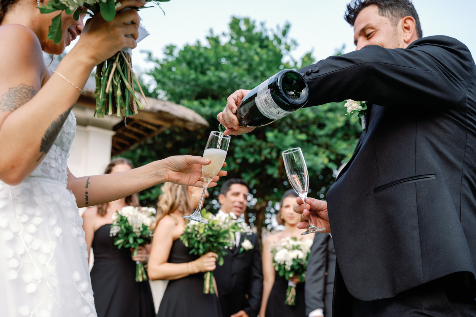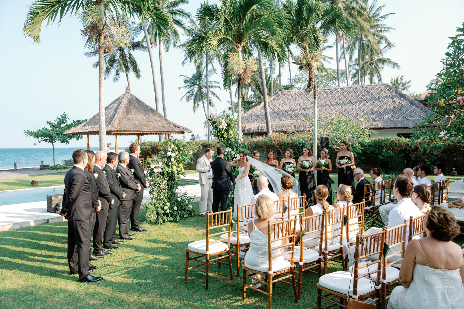 The bride looked stunning in a classic white gown, while the groom’s timeless black suit gave the perfect contrast. Bridesmaids wore black dresses, complementing the groom’s look, while guests dressed in white—together creating a harmonious color palette that blended seamlessly with the garden surroundings. It was a wedding where every detail felt intentional and perfectly balanced.