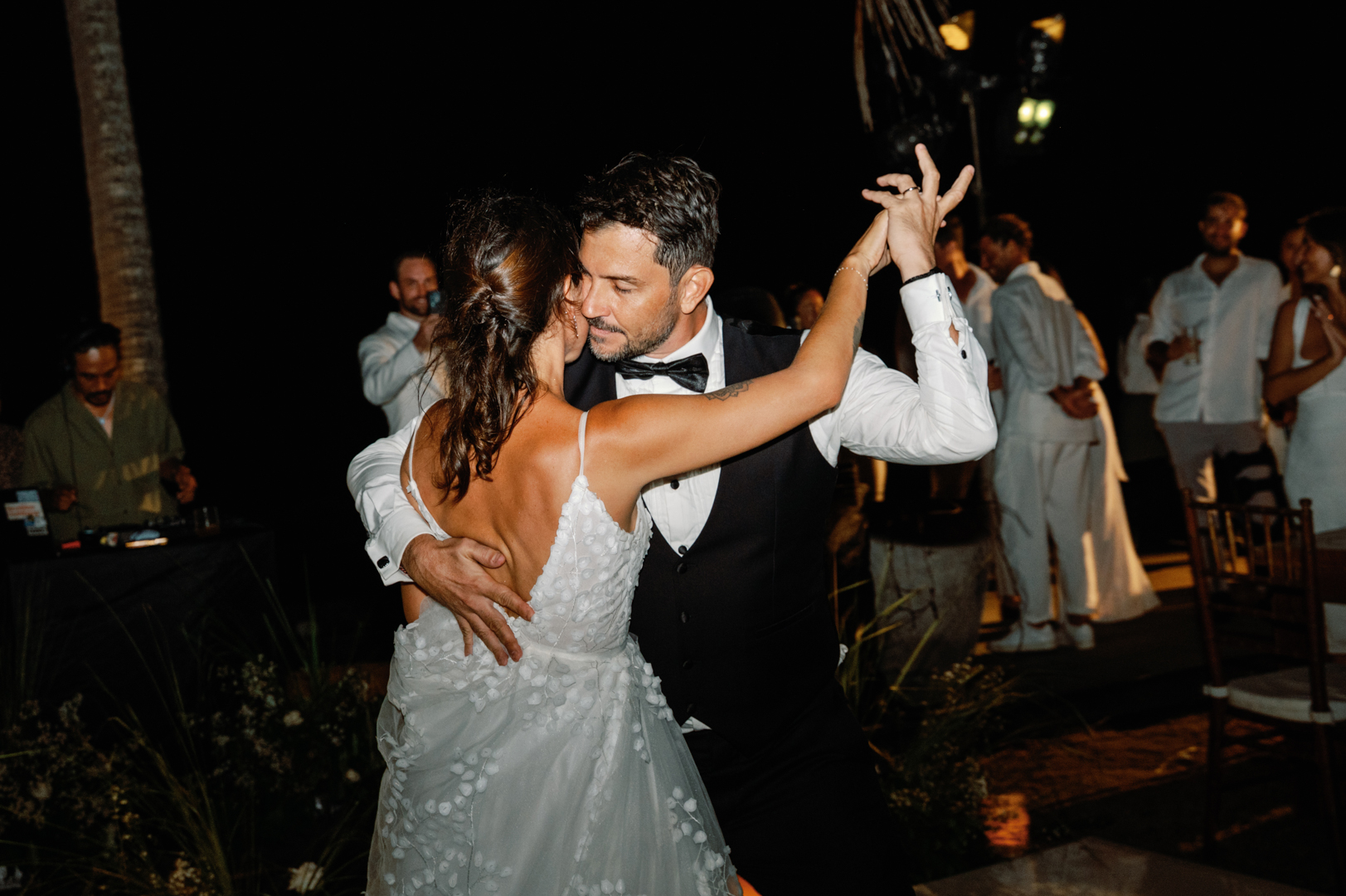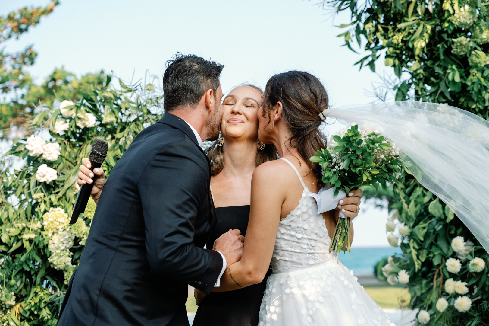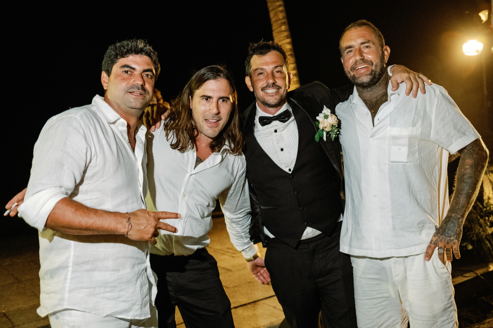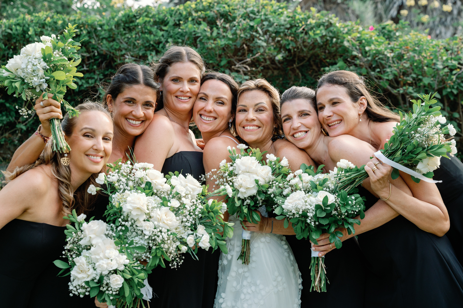 The bride looked stunning in a classic white gown, while the groom’s timeless black suit gave the perfect contrast. Bridesmaids wore black dresses, complementing the groom’s look, while guests dressed in white—together creating a harmonious color palette that blended seamlessly with the garden surroundings. It was a wedding where every detail felt intentional and perfectly balanced.